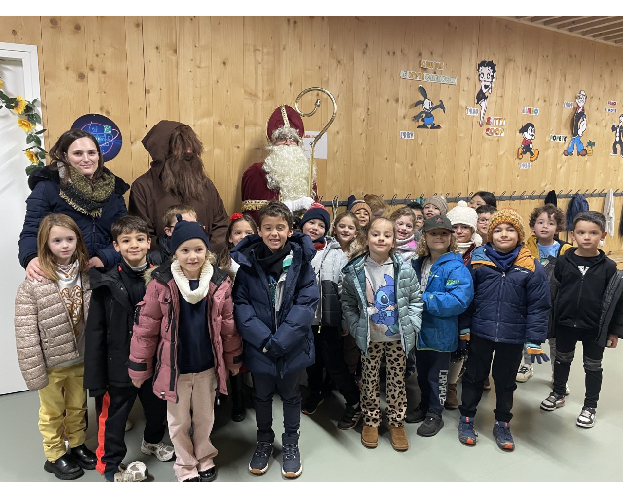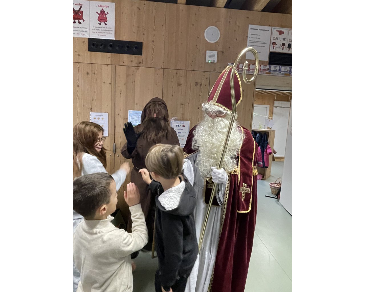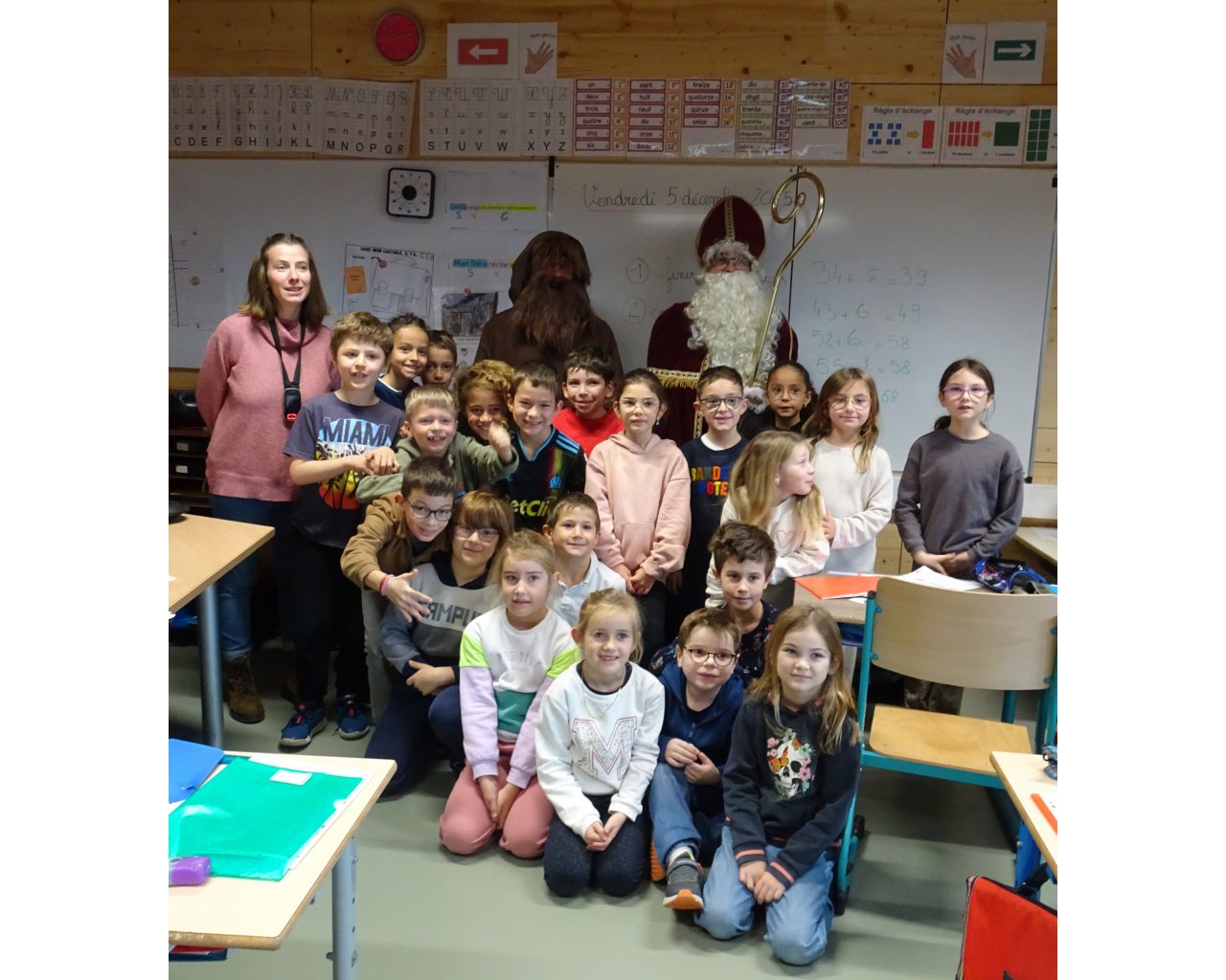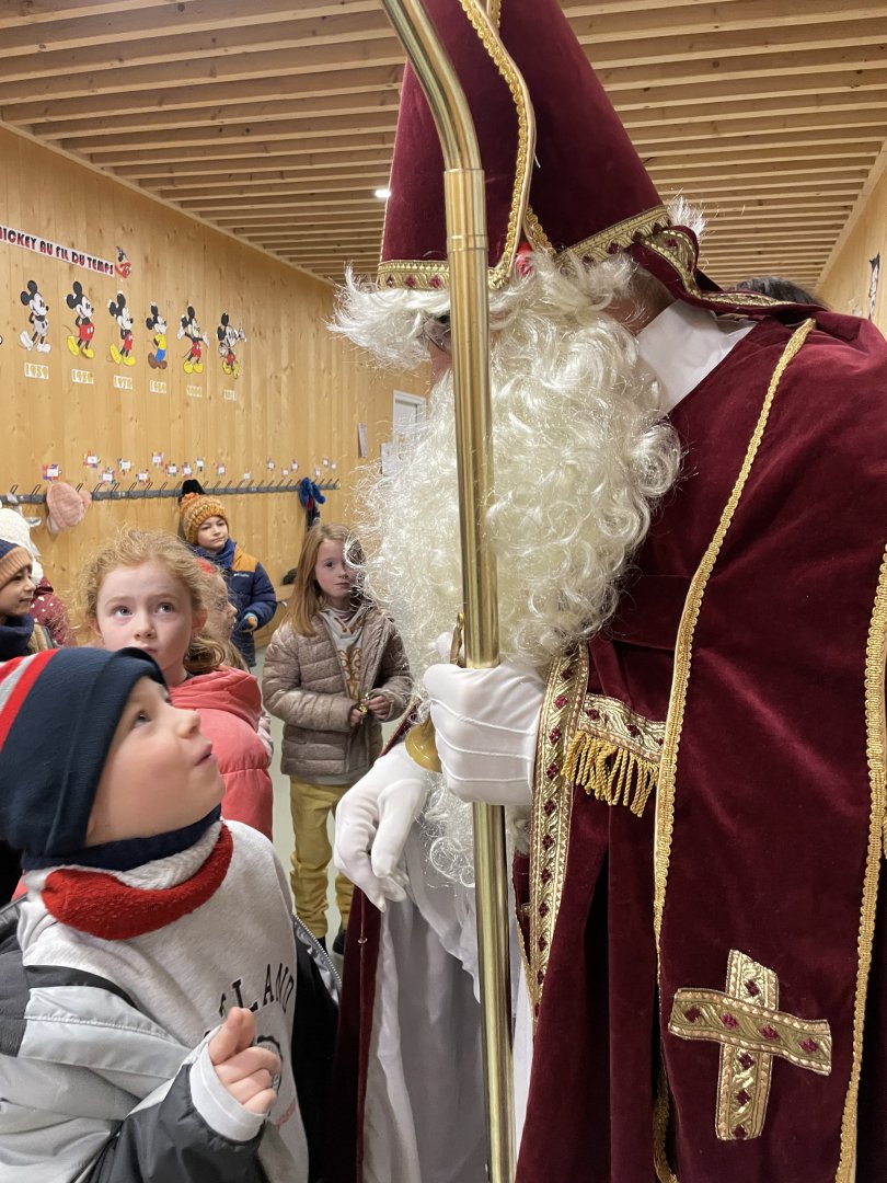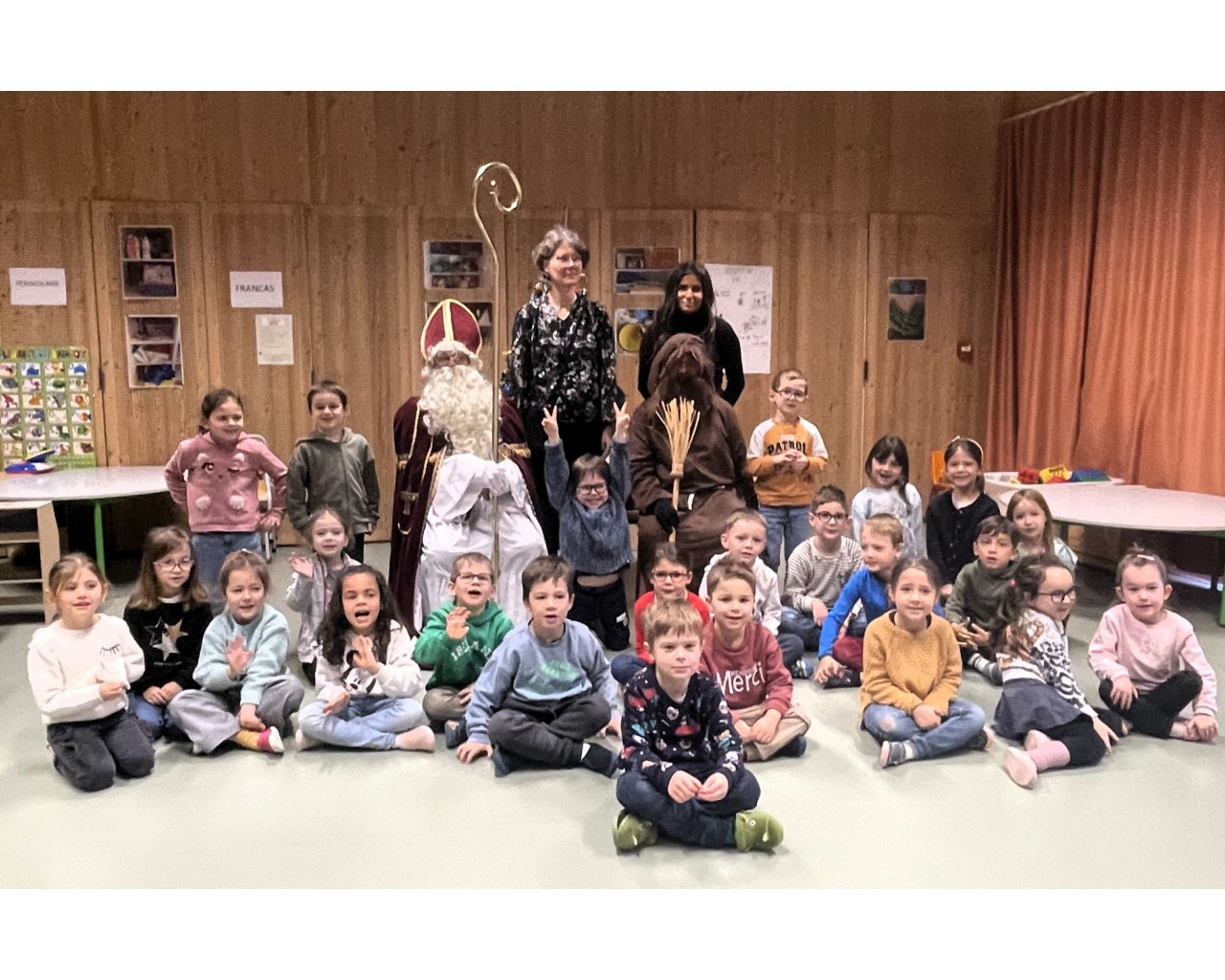 Saint Nicolas, fidèle à la tradition lorraine, a visité toutes les classes où les enfants lui ont chanté des chansons et offert leurs dessins. Même le Père Fouettard, désormais bien moins effrayant, a été chaleureusement accueilli… jusqu'à recevoir un câlin !