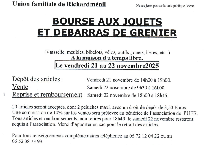 Du Vendredi 21 Novembre 2025 au Samedi 22 Novembre 2025 Bourse aux aux jouets et débarras de grenier Organisée par l'Union Familiale à la M.T.L Renseignements : 06 52 38 73 93 Retour