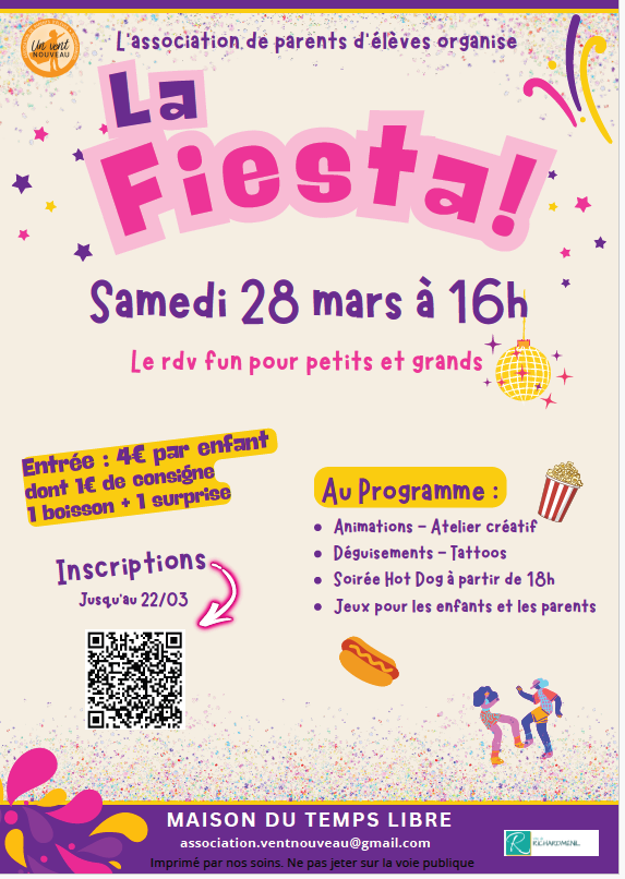 Samedi 28 Mars 2026 La fiesta avec l'association Vent Nouveau La Fiesta, après midi et soirée récréatives pour enfants et parents. MTL, sur inscriptions association.ventnouveau@gmail.com Retour