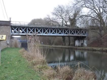 Pont sur le canal km 27,502/pont biais de 25m d'ouverture droite à T.M (portée des poutres 30,36m) avec P.I biais vouté. Tablier rompu côté Blainville. Le grand tronçon appuyé sur la coulée côté Toul est incliné et vient buter le halage. Une locomotrice allemande est engagée dessus |