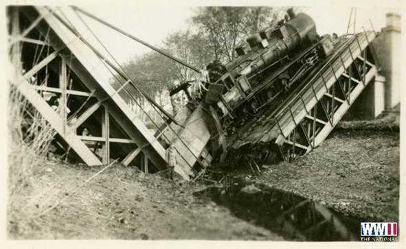 - Le pont et la locomotive ont été sabotés par les allemands juste avant l'arrivée des américains afin de les empêcher d'utiliser cette ligne et expliquant ainsi la présence de GI près et sur la locomotive.